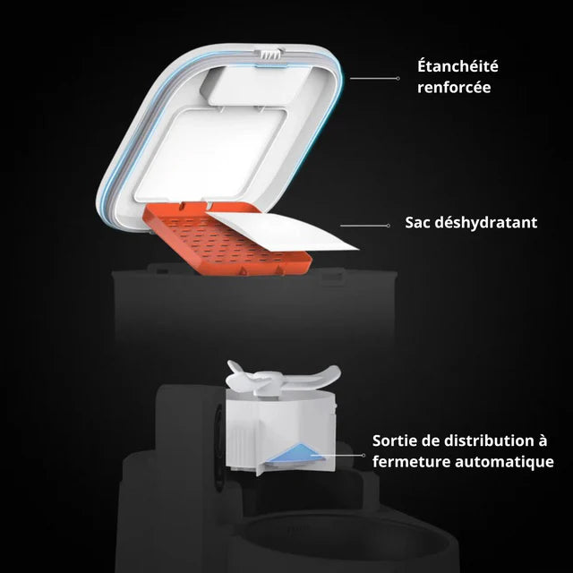 La fonction de fermeture du distributeur de croquettes protége la nourriture de la moisissure et la garde au frais et gouteuse.