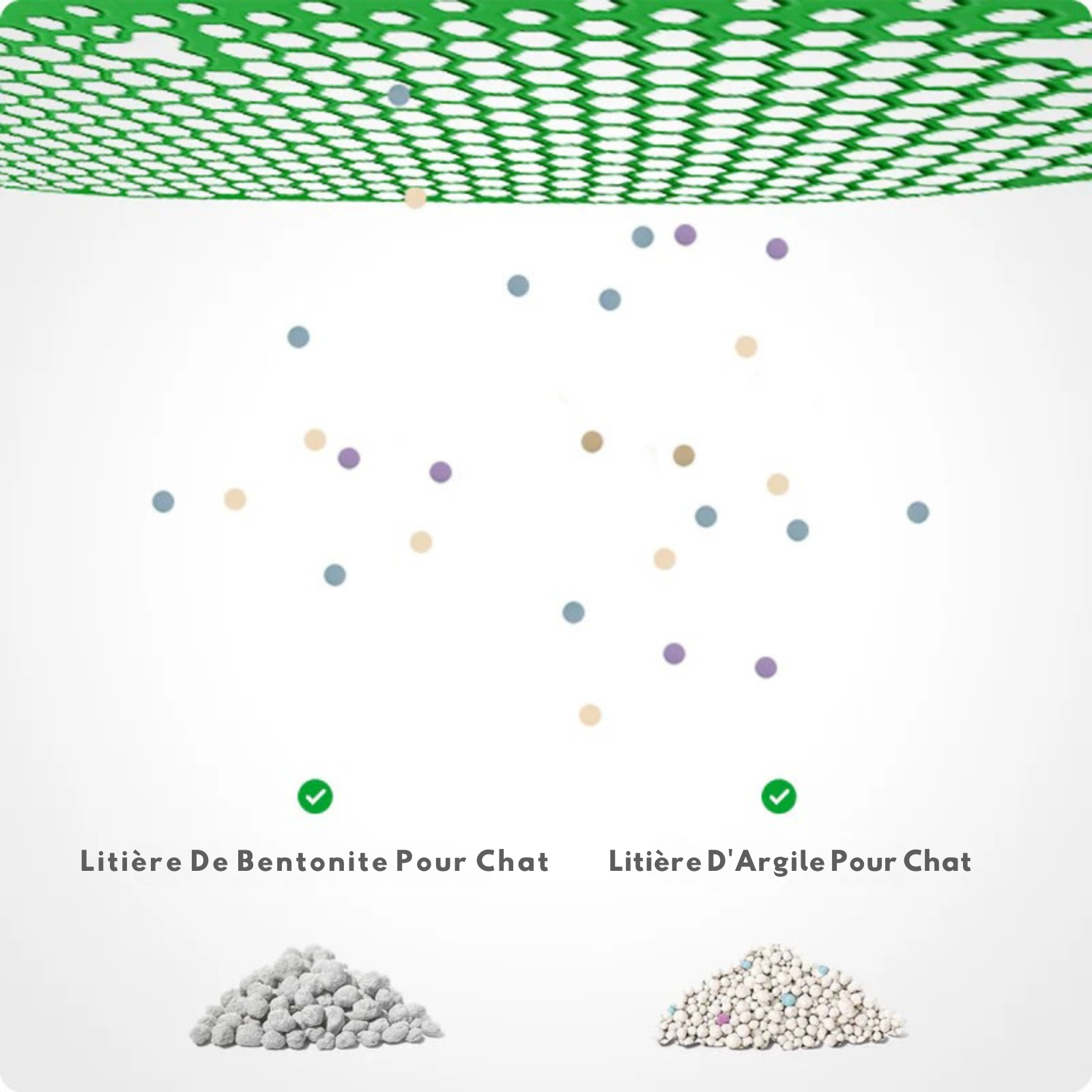 Litière agglomérante en tofu, bentonite, argile et mixte. Les grains ne doivent pas dépasser 1,27 cm.